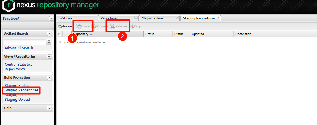 当通过idea提交后的代码会在这里出现一条数据,首先点击close会开始审核,审核通过后点击release即可发布到中央仓库